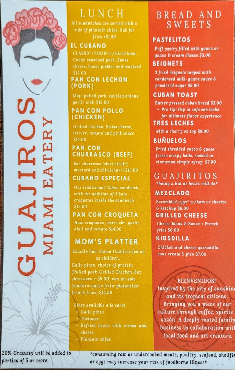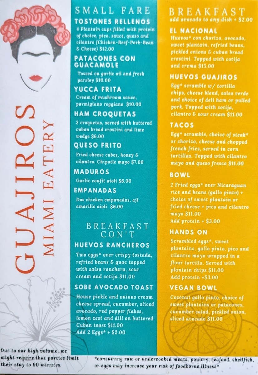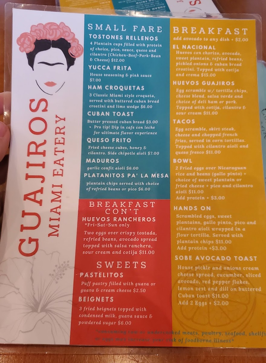 Huevos con chorizo, seasoned avocado, sweet plantain and refried beans topped with queso fresco and crema, pickled onions & buttered cuban toast.