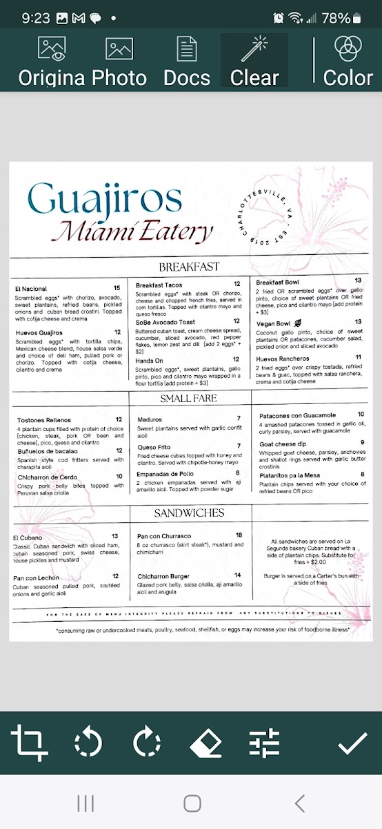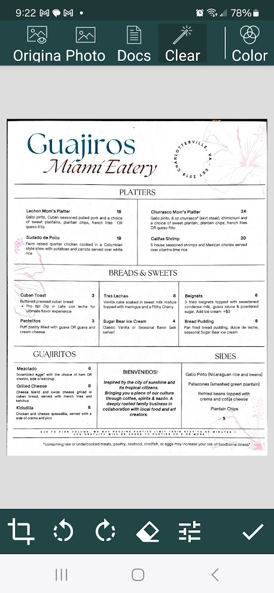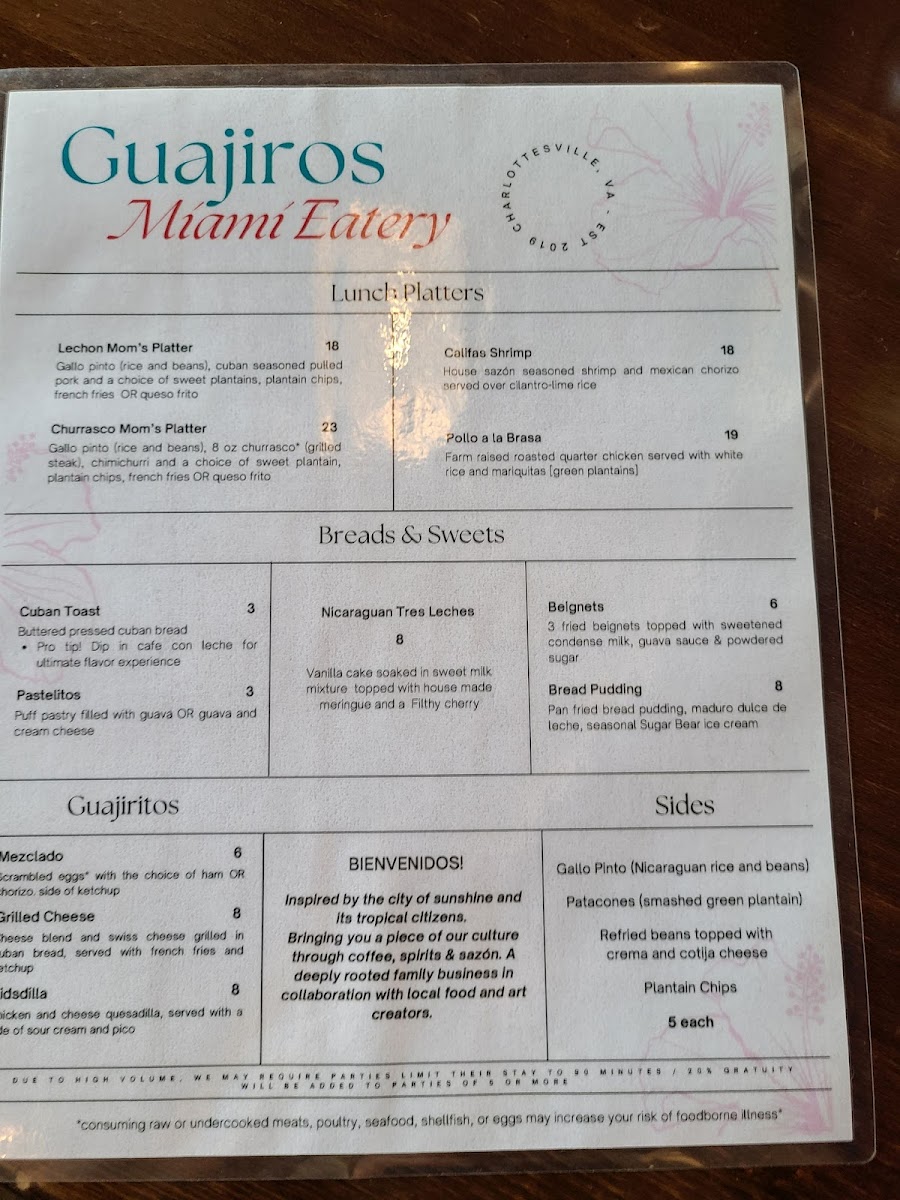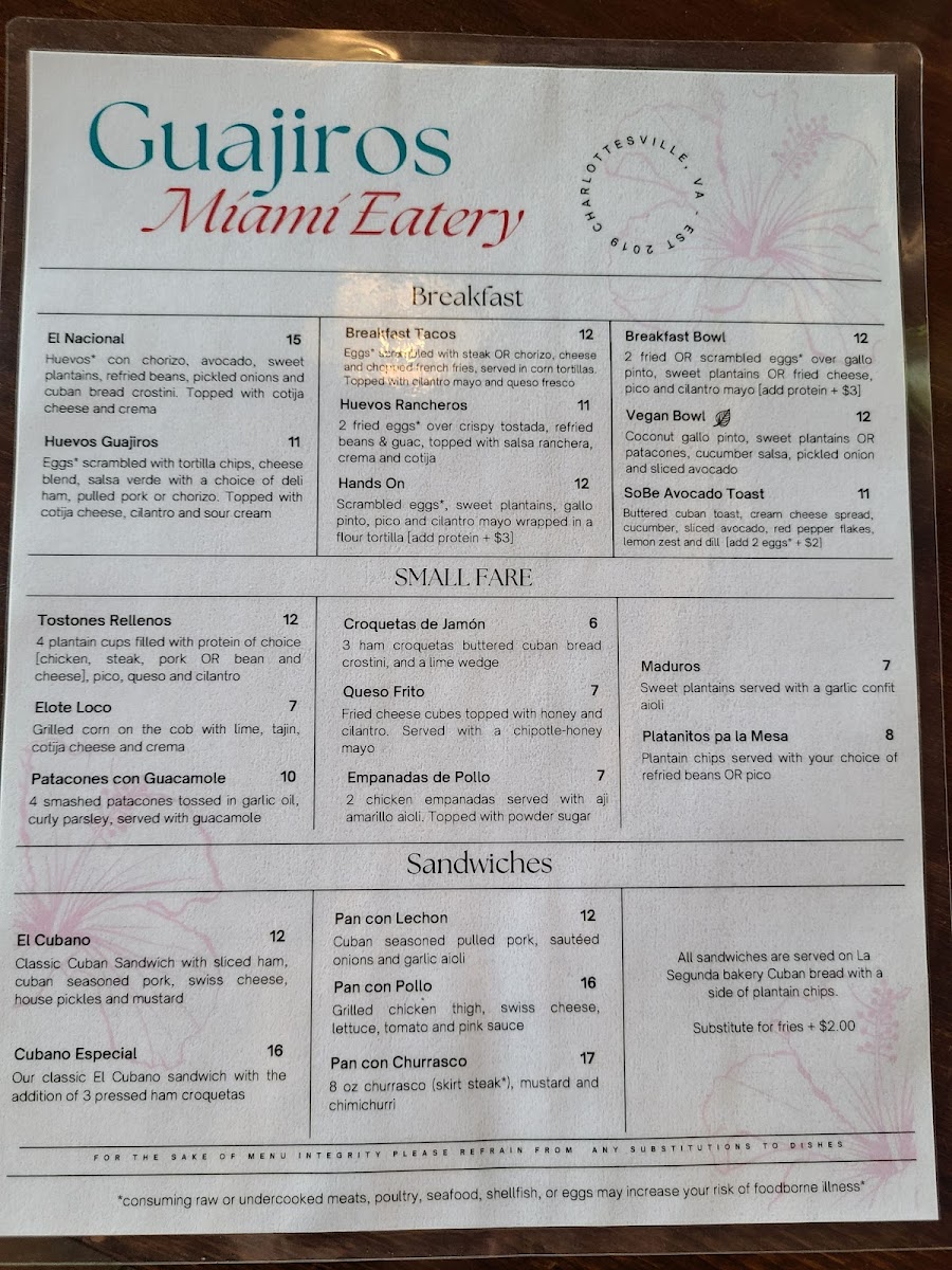 Huevos con chorizo, seasoned avocado, sweet plantain and refried beans topped with queso fresco and crema, pickled onions & buttered cuban toast.